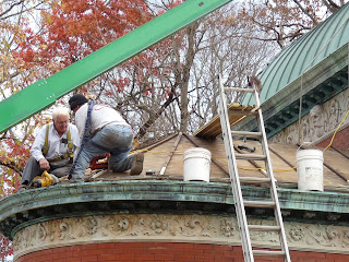 Meanwhile, workers have removed the copper roof from the mechanical room on the north side of the building and have begun to repair the damaged wood slats and battens underneath. This roof was in a slightly worse shape than the roof over the main room, so even though it’s a smaller job, repair work may take a bit longer in this location. Thankfully, we have been blessed–still–with great weather! Keep your fingers crossed that our luck holds!