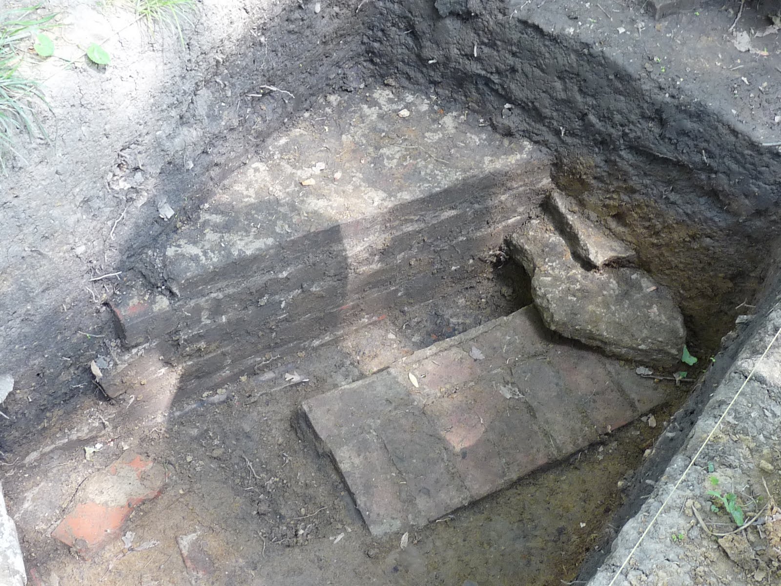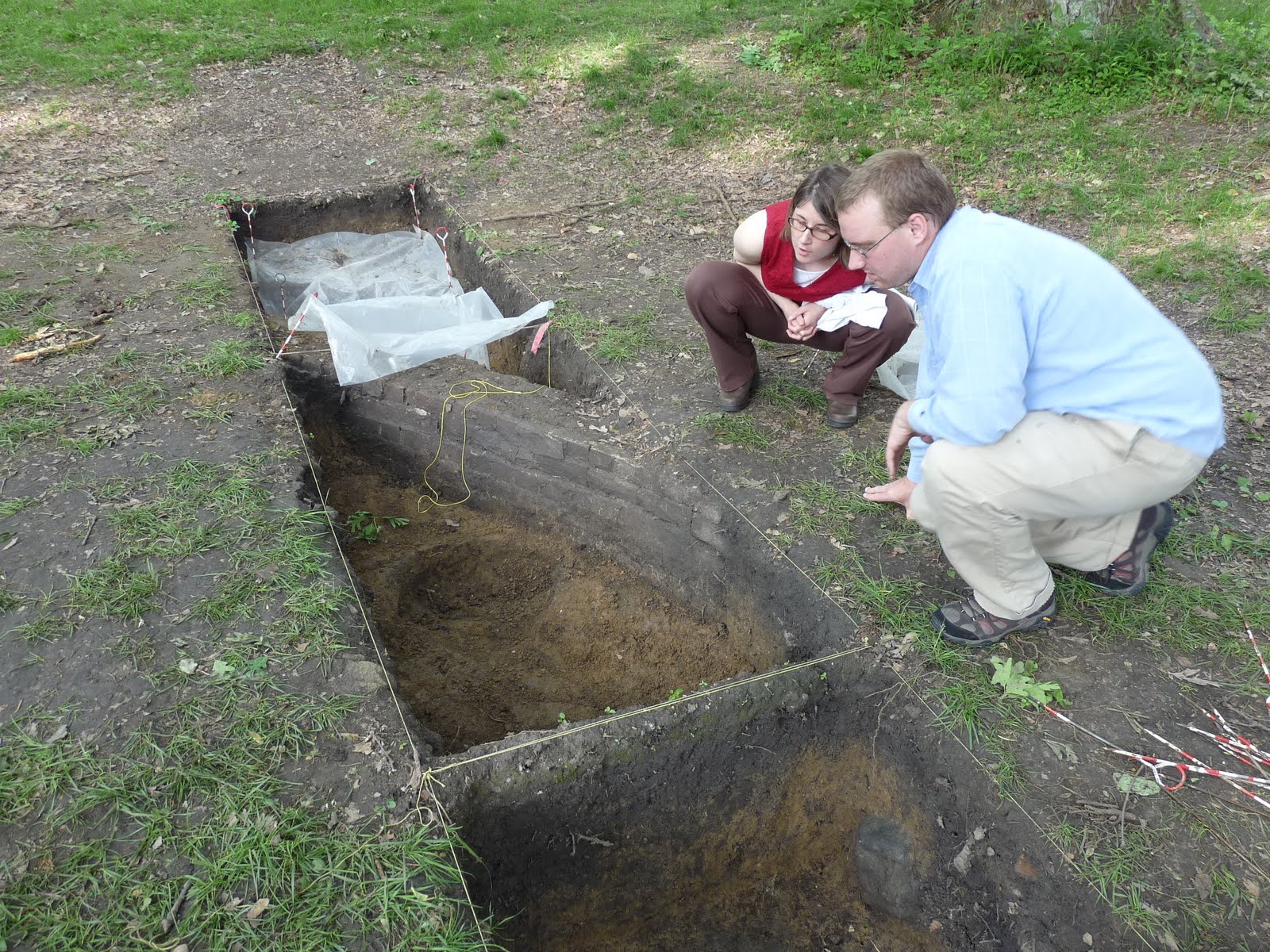 Outside, archaeologists from Weintraut & Associates in Zionsville are working with students from the University of Indianapolis to uncover General Wallace’s backyard reflecting pool. Over weeks of painstaking work, they have found the brick perimeter topped by capstones lying just inches below the surface of the lawn.