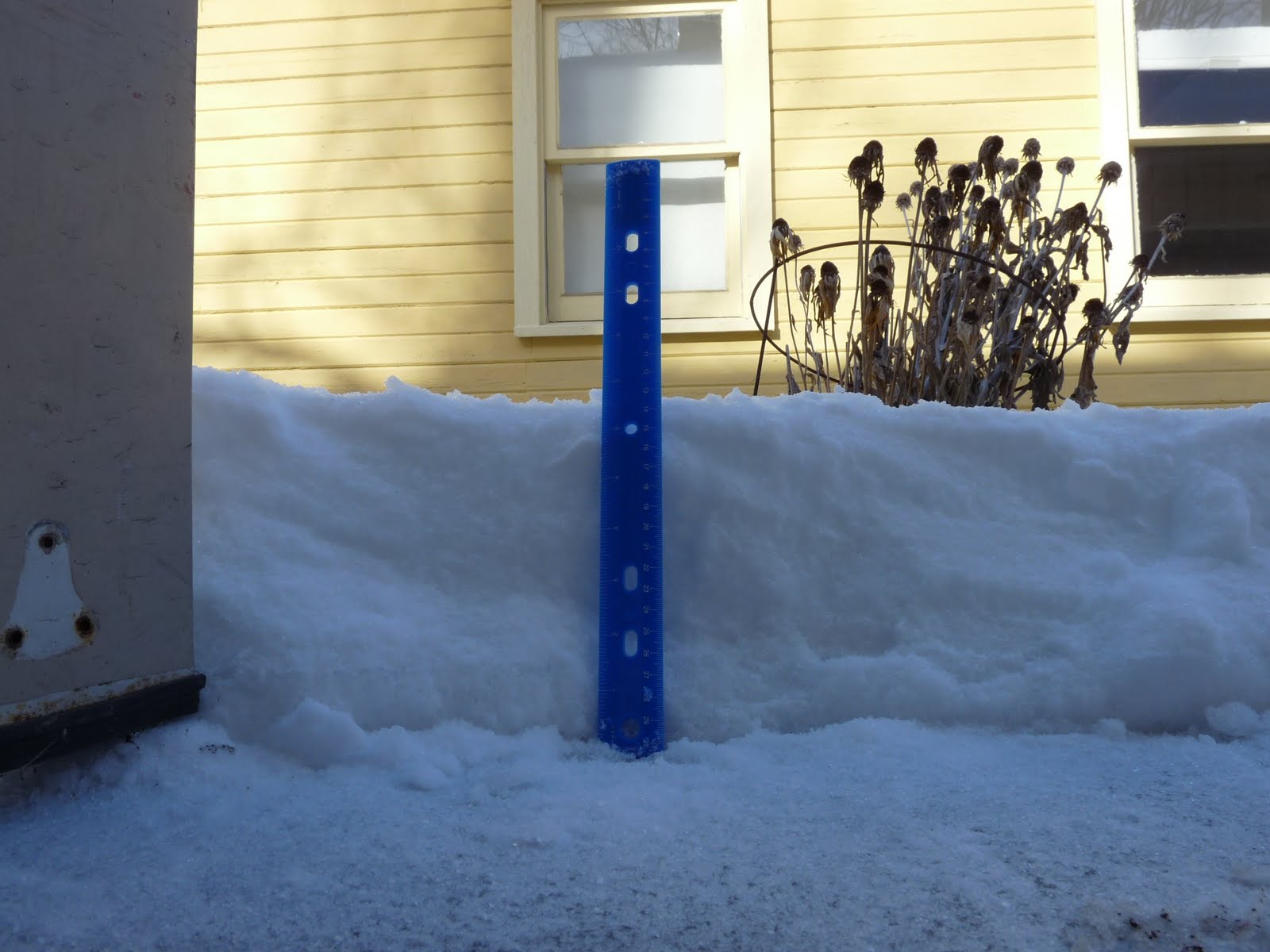 The study gardens have been very active this winter. Since the first of December, the icicle gardens have flourished. Every other week, it seems, a winter weather advisory has been issued. The snow and ice have taken over the grounds. An ice storm left 5.5 inches of ice, to be later covered with 6 inches of snow. A drift between the buildings, after snow removal, left ice 7 inches deep, and had to be chipped away layer by layer. Just late week, the ice and snow melted over most of the grounds, leaving piles in the parking areas.